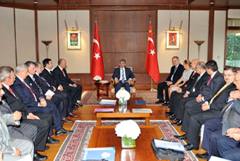 Saat 10:30’da baslayan görüsmeye; Memur-Sen ve Egitim-Bir-Sen Genel Baskani Ahmet Gündogdu, TOBB Baskani Rifat Hisarciklioglu, Türk-Is Baskani Mustafa Kumlu, TÜSIAD Baskani Ümit Boyner, DISK Baskani Süleyman Çelebi, Kamu-Sen Genel Baskani Bircan Akyildiz, Hak-Is Genel Baskani Salim Uslu, TUSKON Baskani Rizanur Meral ve çok sayida STK temsilcisi katildi.