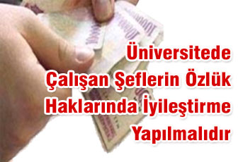‘Esit ise, esit ücret’ ilkesi geregi, idari hiyerarsideki ücret dengesizliginin giderilmesi için bazi kadrolarda çalisanlarin mali haklarinda iyilestirme yapildigi, ancak 1. basamak yöneticilik görevi olan Sef kadrosunda çalisan personelin mali haklarinda herhangi bir iyilestirme yapilmadigi ifade edilen yazida, seflerin alt kadrolari olarak kabul edilen ayniyat saymani, sayman ve bilgisayar isletmeni kadrolari ile aralarindaki ücret dengesizliginin giderilmesini; bunun için gerekli olan 4, 3, 2 ve 1. derece Sef kadrolarina, en az ayniyat saymanina verilen özel hizmet tazminatlarinin verilmesini isteyerek, ek ödeme oranlarinda yapilan düzenleme öncesinde, memurlarin yüzde 50, Sef ve Sube müdürlerinin yüzde 52 iken, yapilan iyilestirmeyle Sube müdürlerinin ek ödemesinin yüzde 100’e çikarildigini, seflerin ise ek ödemelerinde artis saglandigini, 12.01.2010 tarih ve 27460 sayili Resmi Gazete’de yayimlanan Bakanlar Kurulu Karari ile yapilan iyilestirmenin, üniversite sef kadrolarini da kapsayacak sekilde yeniden düzenlenmesini talep ettik.