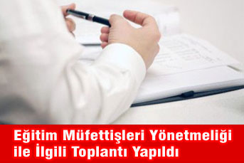 Egitim müfettisleri yönetmeligi ile ilgili toplanti yapildi. 5 saat süren toplantiya, Milli Egitim Bakanligi Personel Genel Müdürü Necmettin Yalçin, 1. Hukuk Müsaviri Osman Çelik, ilgili kurum genel müdür yardimcilari, daire baskanlari, bazi illerin Egitim Müfettisleri baskanlari, Egitim müfettisleri katildi.