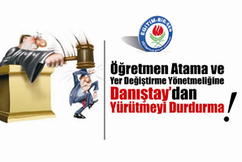 06/05/2010 tarih ve 27573 Sayili Resmi Gazetede yayimlanan Milli Egitim Bakanligi Ögretmenlerinin Atama ve Yer Degistirme Yönetmeligi’ nin hukuka aykiri hükümlerinin iptali için Egitim Bir Sen olarak Danistay Ikinci Daire’sinde açmis oldugumuz davada yürütmeyi durdurma karari çikti.