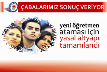 Atanamayan ögretmen adaylarinin sesini dikkate alarak yürüttügümüz mücadele sonuç veriyor. 08.04.2011 tarihinde sitemizden duyurdugumuz “Çabalarimiz Sonucu Yeni Ögretmen Alimi Için Kapi Aralandi” baslikli açiklamamizda da belirttigimiz gibi önce Milli Egitim Bakanligi Ögretmenlerinin Atama ve Yer Degistirme Yönetmeliginde Degisiklik Yapilmasina Dair Yönetmelik 8 Nisan 2011 tarih ve 27899 sayili Resmi Gazetede yayimlandi. “Bakanlikça gerekli görüldügü hallerde kadro imkânlari ve ihtiyaç çerçevesinde agustos ayi disinda da atama yapilabilir” hükmü ile yeni ögretmen alimi için kapi aralandi. 12 Nisan 2011 tarihli Resmi Gazetede yayimlanan Bazi Kanunlarda Degisiklik Yapilmasina Dair Kanun’un Geçici 2. Maddesi 24.745 ögretmen kadrosu için kapiyi sonuna kadar aralamis oldu.
