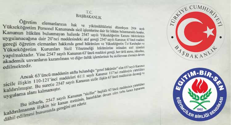 Üniversitelerde Sicil Uygulamasının Torba Kanun'la Kaldırılması İçin Başbakanlığa Yazı Yazdık